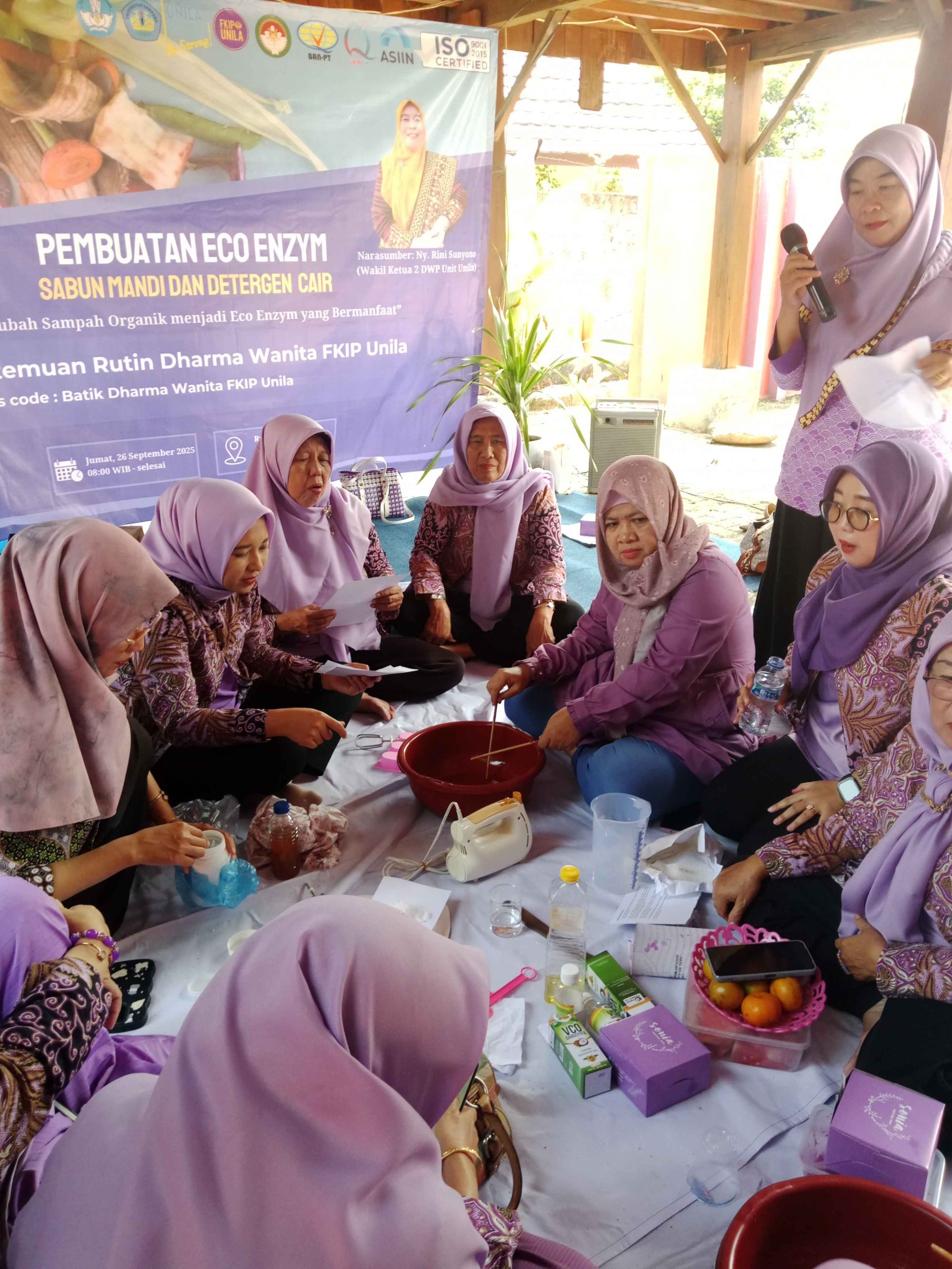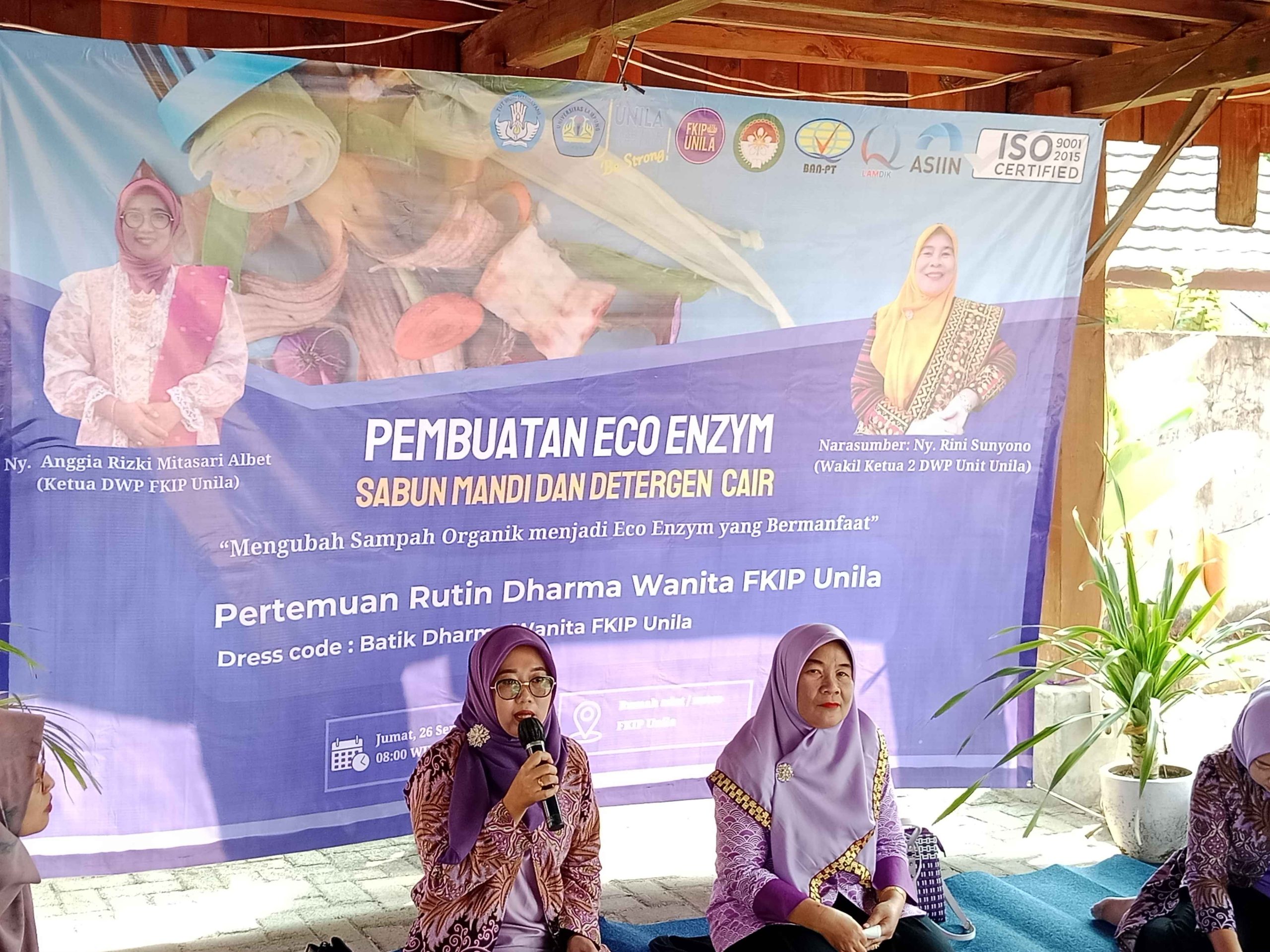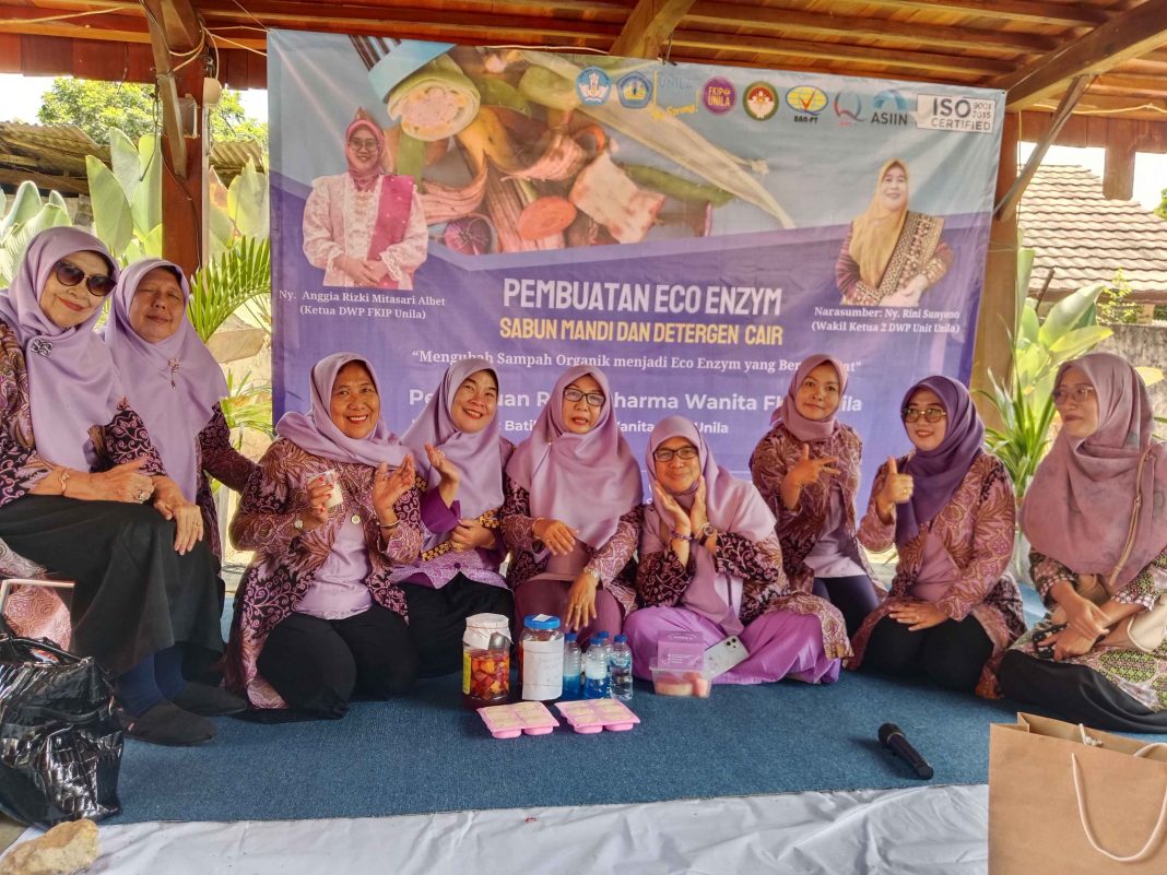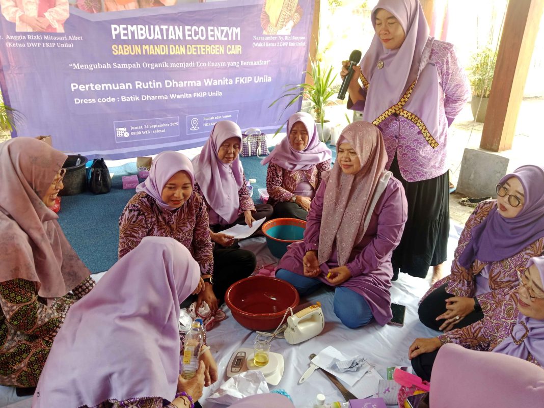 Bandar Lampung, 26 September 2025 – Dharma Wanita Persatuan (DWP) Fakultas Keguruan dan Ilmu Pendidikan (FKIP) Universitas Lampung kembali menggelar pertemuan rutin bulanan. Kali ini, kegiatan dikemas berbeda dari biasanya, dengan menghadirkan workshop pembuatan eco enzym, sabun mandi eco enzym, dan detergen cair, bertempat di Rumah Adat FKIP Unila.