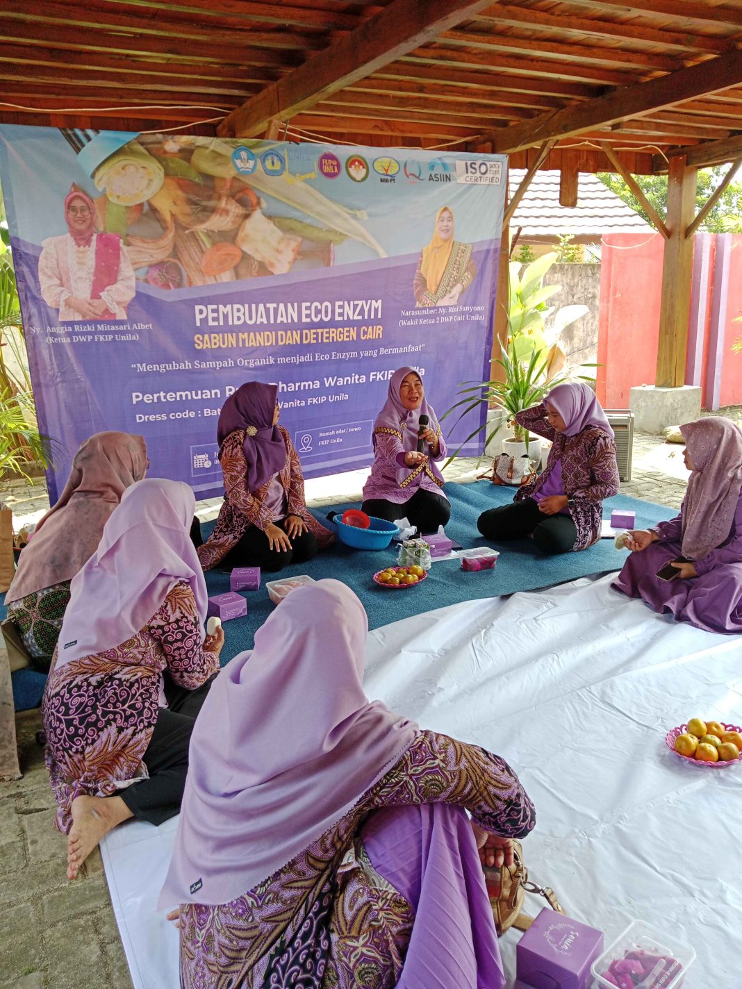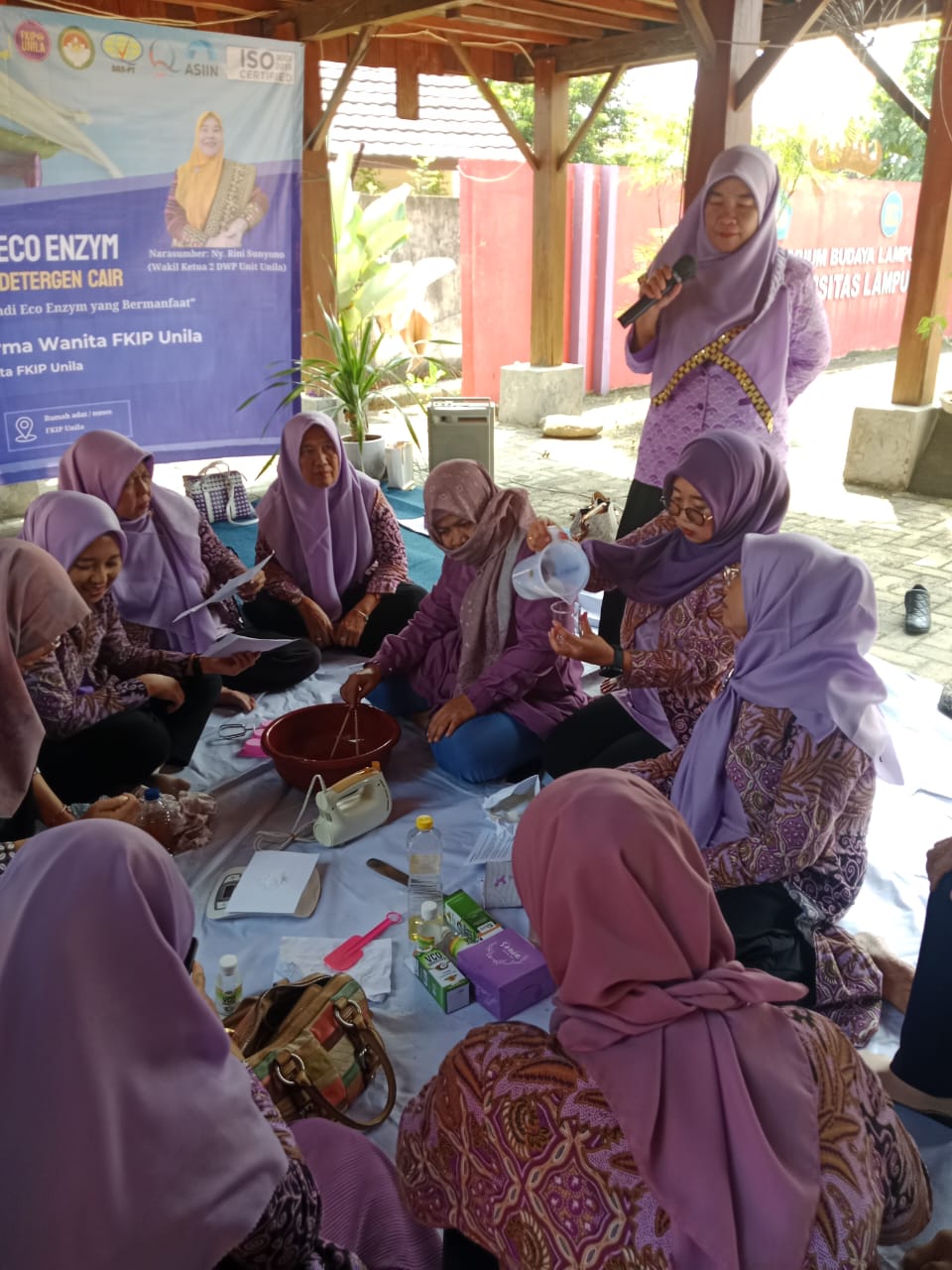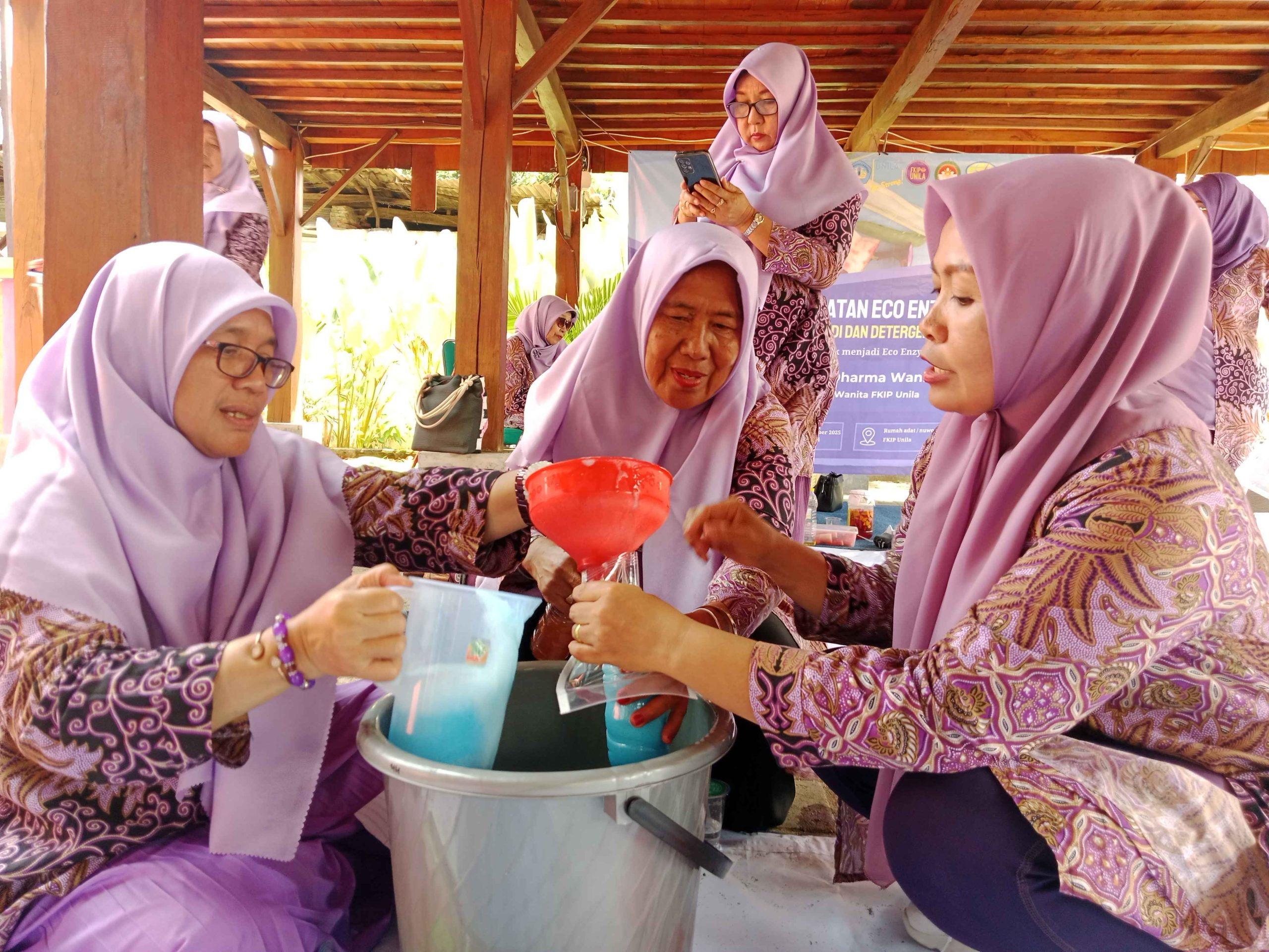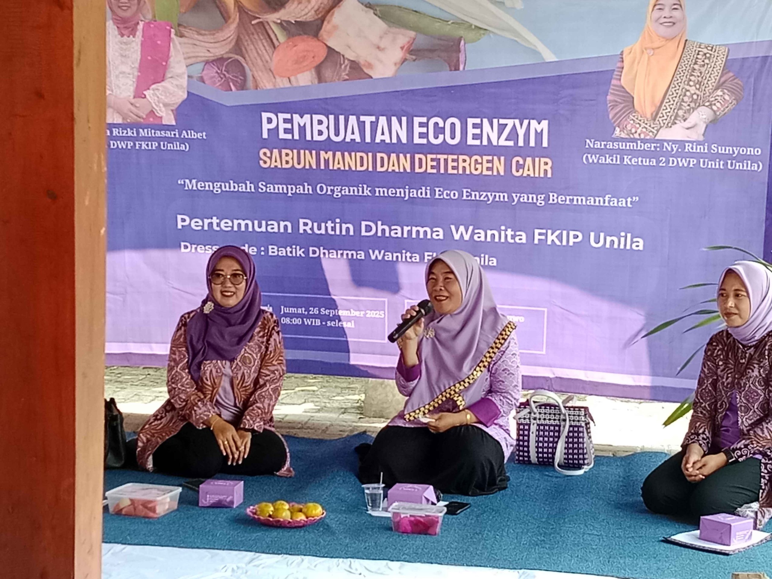 Bandar Lampung, 26 September 2025 – Dharma Wanita Persatuan (DWP) Fakultas Keguruan dan Ilmu Pendidikan (FKIP) Universitas Lampung kembali menggelar pertemuan rutin bulanan. Kali ini, kegiatan dikemas berbeda dari biasanya, dengan menghadirkan workshop pembuatan eco enzym, sabun mandi eco enzym, dan detergen cair, bertempat di Rumah Adat FKIP Unila.