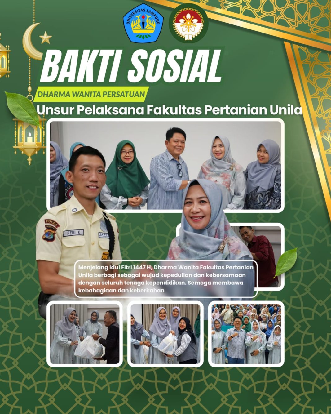 Bandar Lampung, 12 Maret 2026 – Dharma Wanita Persatuan (DWP) Unsur Pelaksana Fakultas Pertanian Universitas Lampung (FP Unila) melaksanakan kegiatan bakti sosial Ramadhan yang berlangsung pada Selasa, 10 Maret 2026 di Gedung A1 FP Unila. Kegiatan ini merupakan wujud kepedulian sosial sekaligus bentuk kebersamaan dalam menyambut Hari Raya Idulfitri.